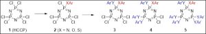 English page ヘテロ原子化学 シクロトリホスファゼン誘導体は難燃剤やハードコート剤などに用いられている。ヘキサクロロシクロトリホスファゼン 1 の P-Cl 結合は反応性が高く,アニリン,フェノール,チオフェノールなど種々の求核剤で置換することができる。これらを一つ導入した化合物 2 を選択的に合成し,さらに第二の置換基を一つ,三つ,5つ導入した 3, 4, 5 の選択的合成を検討している。