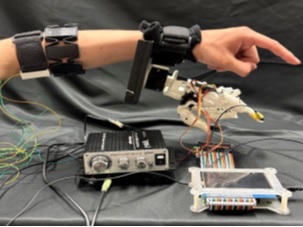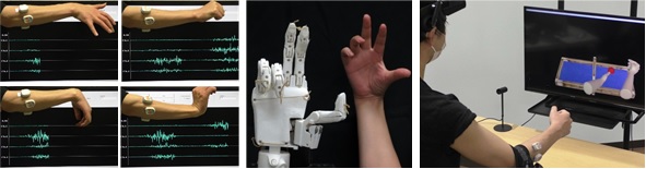 We are developing systems such as prosthetic hands that can be controlled via weak electrical potentials arising from muscle activities (electromyogram signals) and home appliance control systems using electroencephalogram signals. Accurate operation of these systems requires both advancements in AI technologies used internally and improvements in the user’s ability to control biological signals. Therefore, we are developing learning and classification models for biological signals and training methods in virtual environments. Furthermore, we are exploring sensory feedback mechanisms to closely replicate the human hand.